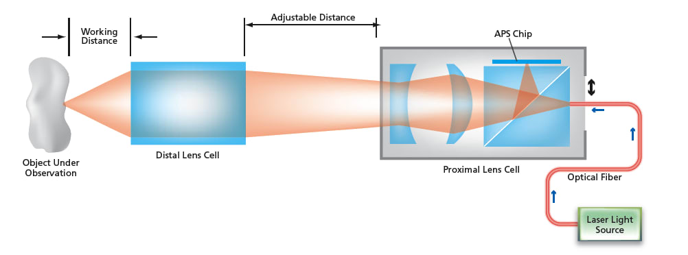 The proximal lens cell would be mounted on a sled that could be translated along the optical axis for focus adjustment. The position of the CHAMP would initially be chosen at the desired working distance of the distal lens from (corresponding to an approximate desired magnification of) an object to be examined. During subsequent operation, the working distance would ordinarily remain fixed at the chosen value and the position of the proximal lens cell within the instrument would be adjusted for focus as needed.