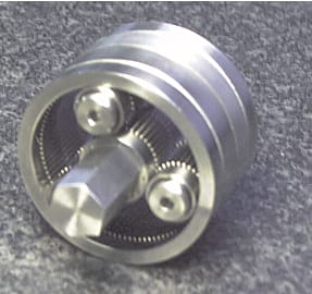 Figure 1 shows a working gear-bearing transmission with 70/1 gain in a 1.25-in.-diameter-by-0.75-in. (3.18-cm-diameter-by-1.91-cm) package. Gear bearings exist as spur- or helical-gear variants of two basic types: roller gear bearings and phase-shifted gear bearings. For the sake of brevity, only spur-gear variants are described here; suffice it to say that the principles of operation of the helicalgear variants are similar.
