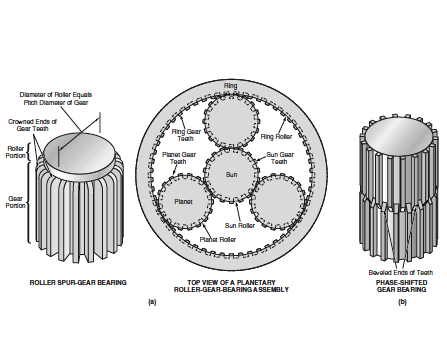 Figure 2(a) depicts selected aspects of roller spur-gear bearings and a partial planetary assembly containing roller spur-gear bearings. The diameter of the roller portion of each roller spur-gear bearing equals the pitch diameter of the spur-gear portion. The gear teeth are crowned at the roller end, such that the apogee of the crown on each tooth lies at the roller diameter/ pitch diameter: This arrangement provides thrust-bearing strength as well as matching of speeds and, hence, efficiency.