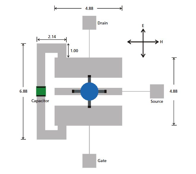 Figure 1. A Schematic of Oscillator Antenna is shown with feedback loop. The dimensions are in millimeters. The solar-powered oscillator antenna includes a commercially available super-low-noise, high- frequency field-effect transistor integrated into the center of the segmented microstrip-patch antenna. Along with bias lines, a feedback loop, and other conductors that are parts of the oscillator antenna circuitry, the patch antenna was formed by etching the corresponding pattern out of a surface metal layer on the substrate, which is a commercial microwave laminate having a relative permittivity of 10.2 and a thickness of 0.635 mm. The oscillator antenna occupies an area of 5 by 6 mm on the substrate. The oscillator feedback path extends between the drain and gate terminals of the transistor and includes a 1.2-pF capacitor that passes the oscillation signal while providing DC isolation between the drain and the gate.