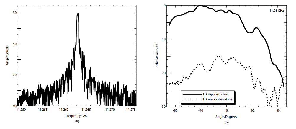 Figure 2. Performance Characteristics: (a) RF power emitted from solar powered radiating oscillator (the resolution bandwidth is 270 kHz) and (b) far field radiation pattern of solar powered radiating oscillator antenna. A comparison between simulated and experimental performance data confirmed that the oscillation frequency is controlled mainly by the length of the feedback path. The RF signal radiated at the fundamental frequency from the solar powered antenna is shown in Figure 2(a). The magnetic field radiation pattern of the solar powered antenna is shown in Figure 2(b). The solarpowered oscillator antenna radiates a power of 1.8 mW at a frequency of about 11.2 GHz with a directivity of 5.25 relative to an isotropic radiation pattern. The power in the second harmonic at 22.4 GHz is 20 dB below the fundamental signal level. It has been found that a current of about 120 mA is needed to initiate oscillation, but thereafter the device can continue to oscillate at a current <20 mA. One of the drawbacks of using commercial solar cells is its large size due to low efficiency. Ways to minimize solar-cell area could include: (1) powering the oscillator antenna from a rechargeable battery that would be recharged by a single, smaller solar cell, (2) the use of more-efficient solar cells, and/or (3) the use of a capacitor to supply the high current needed to start oscillation.