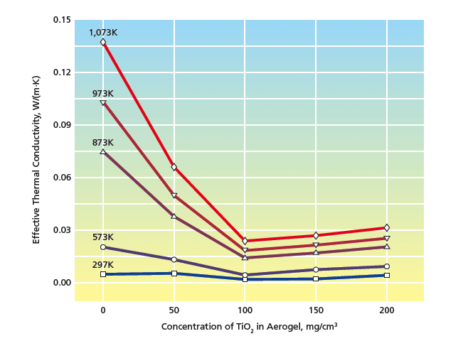 The document titled "Composite Silica Aerogels Opacified With Titania" from NASA's Jet Propulsion Laboratory discusses advancements in aerogel technology, specifically focusing on the incorporation of titanium dioxide (TiO2) to enhance the thermal insulation properties of silica aerogels. Aerogels are known for their exceptional thermal insulation capabilities, and the addition of TiO2 is aimed at optimizing their performance across various temperature ranges.