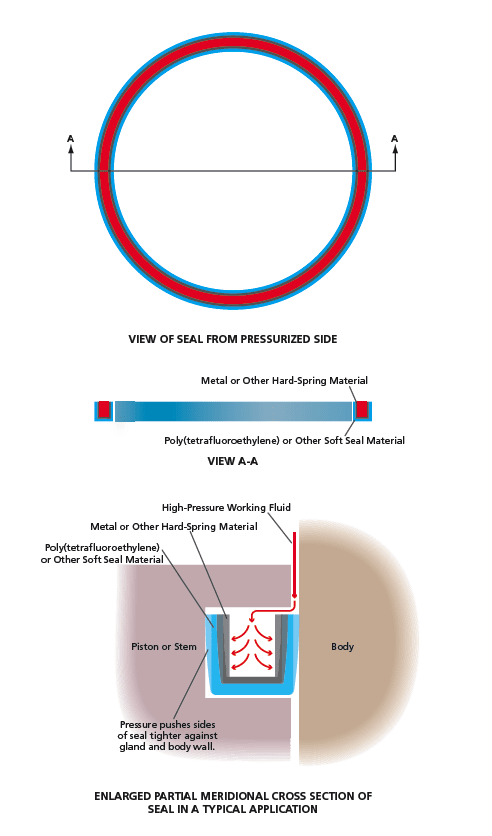 Pressure-energized seal rings intended to withstand flows better than do conventional pressure-energized seal rings have been conceived. The concept applies, more specifically, to seal rings used on some valve stems, pistons, and the like. A conventional pressure-energized seal ring generally has a U-shaped cross section and consists of an elastomer or other suitable polymer with an embedded metal energizing spring (see Figure 1). The working fluid from the high-pressure side that one seeks to seal is allowed into the U-shaped cavity, so that the pressure pushes the sides of the seal ring tighter against the gland and body sealing surfaces, thereby increasing the degree of sealing. Unfortunately, when the seal ring is exposed to flow of the working fluid, under some conditions, the flow grabs the lip of the U-shaped cross section and ejects or deforms the seal ring so that, thereafter, a proper seal is not obtained.