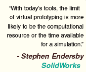 Stephen Endersby, product manager of simulation products for SolidWorks Corp., agrees that computational restrictions are a major roadblock to true virtual prototyping. “With today’s tools, the limit of virtual prototyping is more likely to be the computational resources or time available for a simulation.”