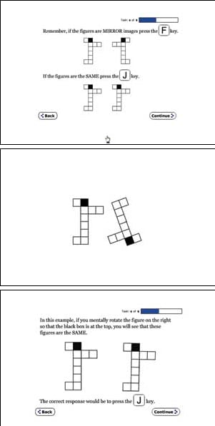 The MRAB consists of nine short Web-based exercises that measure a person’s information-processing functions. It takes about 25 minutes to complete, and users are instructed that final scores will be based on both speed and accuracy. Subtests measure the subject’s ability to focus while ignoring irrelevant information: Users are required, for instance, to rapidly indicate the number of digits in “6666” by pressing “4” rather than “6,” the numeral that is actually repeating. Other subtests measure working memory, functioning similarly to the game Concentration, quizzing the user on where or when a numeral appeared on the screen. Mental rotation, the ability to identify whether shapes are flipped versus merely rotated, is a problem-solving skill that MRAB tests, as is verbal reasoning, assessed by asking users whether a series of statements are logically connected. Perceptual reaction time is a subtest that requires a user to press keys corresponding to red-flashing numerals as quickly as possible. The MRAB also measures the ability to sustain attention and vigilance, as well as the converse ability to divide one’s attention.