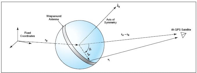 The iterations follow one of two courses, depending on whether or not ||rpi|| and the attitude of the body are known a priori. If the attitude is known, then zˆB is known and can be inserted in equation 2, which yields cos(ßi) for use in equation 1. Then ||rpi|| and cos(ßi) can be used in equation 1 without further ado. If ||rpi|| and zˆB are not known a priori, then it is necessary to determine ||rpi||,the attitude, and the phase-correction term ||rpi|| cos(ßi) from a least-squares or other fit of (a) an approximate geometric model of the amount by which the phase at rpi leads the phase at rB to (b) phase measurements for all of the GPS signals detected by the receiver.