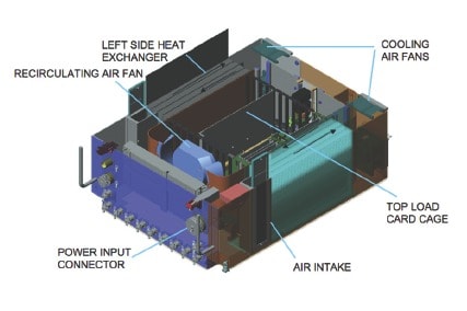 The first challenge is providing a rugged outside housing for the payload. In this solution, we chose to go with an ATR-style (see Figure 1) form factor because it is a common platform that has had a proven record for many years. The other advantage to this style of form factor is that it will easily mount into many existing applications, and there are a number of readily available shock-isolated trays on the market that can help meet the rugged vibration environments. It is also important to find that optimal balance between the weight and ruggedness required. A designer could go with a brazing approach, but this typically adds unacceptable cost and lead time to the program. The more economical approach would be to go with a welded/bolted-together construction method. This still provides significant strength, but also reduces the weight, cost, and lead time. It is also very important to include a rugged military finish or paint on the outside surfaces to further protect the enclosure from the harsh environments. The paint for this solution was chosen for its UV reflective properties to reduce the heat load generated by external solar radiation. In addition to the structural integrity and resistance to the environments, serviceability plays a big factor in the final design. The air intake filters on this unit are important to get the air into the chassis, but just as important is the ability to remove these filters and service them in the field, eliminating costly depot maintenance time.