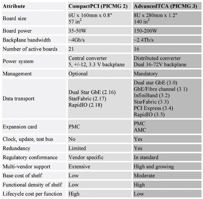 The Advanced Telecommunications Computing Architecture (ATCA), also known as PICMG 3.0, is a new set of open standard specifications defining a common platform for high-performance, next-generation telecom and datacom applications. The goal of the ATCA standard is to provide an open platform standard to meet the needs of telecom infrastructure equipment for the next decade. Over 100 companies and more than 11,000 person-hours went into developing the ATCA specifications during a period of 15 months. Compared to its predecessor, the CompactPCI standard (PICMG 2.0), ATCA offers far greater bandwidth, greater power and cooling capabilities, larger board real estate, the integration of base-level system management, and the removal of parallel buses that may cause a single point of failure. More comparisons are listed in Table 1. The key benefits of the ATCA platform include a faster time to market and lower overall development costs. The specification is defined on modular concept providing for an assortment of building blocks ranging from silicon solutions, boards, chassis, middleware, operating systems, and applications, among others. The benefits to equipment manufacturers are many, as these standards-based building blocks will allow for a lower cost of market entry and investment costs, more efficient inventory management, and a focus on higher value-added differential services while delivering cost-competitive products.