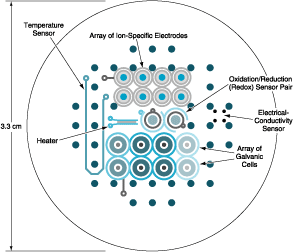 This version of the electronic tongue includes a heater, a temperature sensor, an array of ion-specific electrodes, an oxidation/reduction sensor pair, an electrical-conductivity sensor, and an array of galvanic cells, all on one compact ceramic substrate (see figure). Special-purpose electronic excitation and readout circuitry for the sensors has also been constructed.