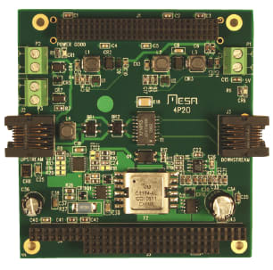 The MESA 4P20 is an 11W POE power supply for PC/104 and PC/104-PLUS systems from MESA Electronics (Richmond, CA). The 4P20 allows a remote PC/104 system to get power from a single CAT5 cable up to 100 meters long. The 4P20 supplies 5V at up to 2A, +12V at up to 200 mA, and -12 at up to 100 mA via the bus connectors to the PC/104 stack.