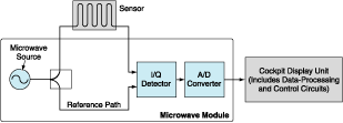 The system (see Figure 1) includes a microwave module that contains a continuous-wave microwave signal source, the output of which is split onto a sensor path and a reference path. The sensor path consists of a microwave transmission line that includes a sensory portion of either the ground-plane coplanar-waveguide (CPW) type or the slot-line (SL) type. Whichever type is used, the sensory portion of the transmission line is mounted flush with the aircraft surface at the desired ice-detection location. With the exception of the sensory portion of the transmission line, the aforementioned circuitry is enclosed within an electrically conductive box. The sensor- and reference-path outputs are processed through an in-phase/quadrature (I/Q) detector, then through an analog-to-digital (A/D) converter. The output of the A/D converter is sent to data-processing and control circuitry in a cockpit display unit.