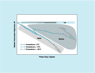 The data-processing subsystem computes the magnitude and phase of the sensor signal relative to those of the reference signal, and uses the sensor signal obtained when the sensor is bare to normalize the response of the system when water and/or ice are present. The normalized magnitude and phase response of the system serves as an indication of the thickness of ice and or water (see Figure 2).