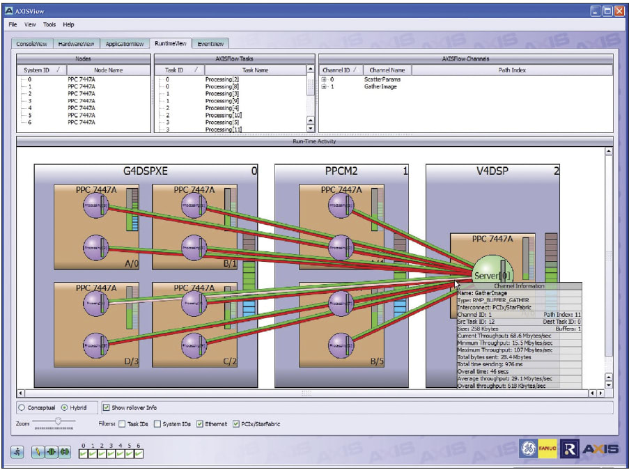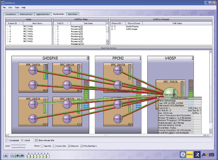 Figure 3 shows a tool that gathers runtime data from the target system and displays the data in an easy to understand, intuitive manner. For instance, when the cursor is placed over an interconnect path, a pop-up window lists data about that link — interconnect mechanism, source and destination tasks, current, average, maximum and minimum throughputs and so on. This view allows an engineer to easily visualize system hotspots for processing and data movement. Armed with this data and the configuration utility, it is quick and easy to change the allocation, and then rebuild and retest.