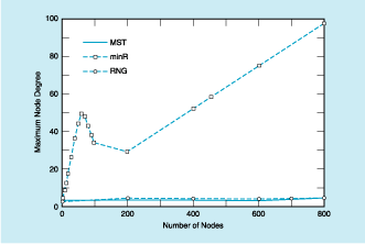 The comparison among the three algorithms is unavoidably complex because each offers both advantages and disadvantages with respect to the others. The figure presents an example of comparison with respect to the maximum node degree, which is only one of several different measures applied to results of computational simulations. The only general conclusion that one can draw from the comparisons by this and other measures is that the graph properties of the RNG are good, relative to those of the minR graph and the MST and that the RNG is suitable for efficient dissemination of information to all the nodes of a network.
