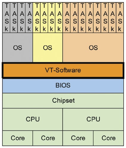 Virtualization technology allows a single physical machine to function as multiple "virtual" machines. A layer of Virtual Machine Monitor (VMM) system software manages the execution of multiple operating systems without incurring significant emulation costs. The multiple operating systems share the hardware, with full transparency to the operating systems and application software (Figure B).