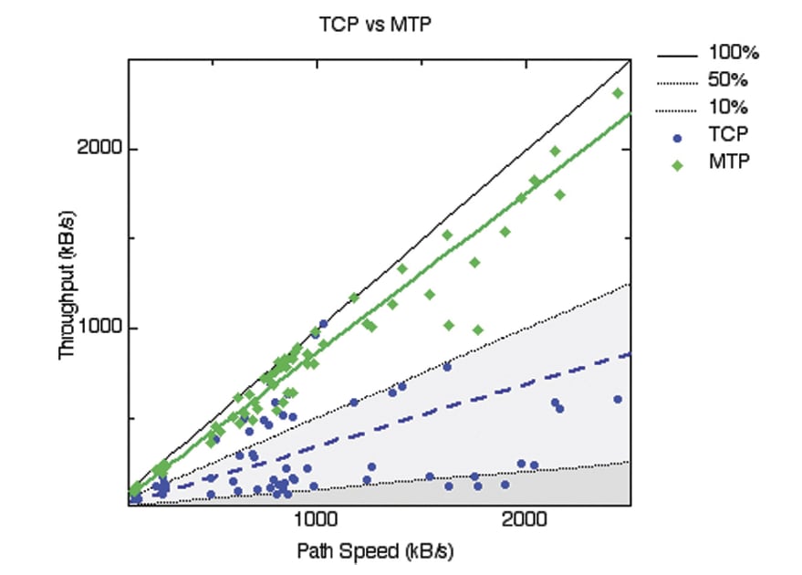 For many MTP users, this translates into seven times faster data transfers over high-speed WANs, and ten times improved reliability on any network, when compared to even modern TCP implementations. This holds true even for data that is already compressed and completely unique, where compression and caching would break down. Most importantly, the results are scalable; the adaptive nature of the protocol means no setup tuning or special equipment is needed.