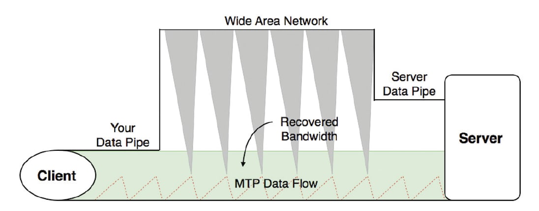 MTP takes advantage of the typically half-duplex nature of most data transfers by positioning its core flow-control algorithms at the receiving, rather than the sending end. This gives it a much more immediate and realistic view of what's going on in the network. Better input means faster adaptation to the network conditions of the moment, both at startup and throughout the transaction. As a result, MTP is able to ensure that the data pipe stays full, but not overflowing.