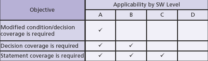 Code coverage has several levels of precision with, at a minimum for DO- 178B, Level C, which shows that test cases executed a line of source code at least once. Greater precision is required as the safety level increases. The following table illustrates the amount of structural coverage required per safety level: