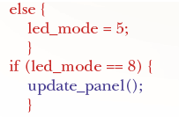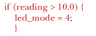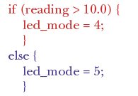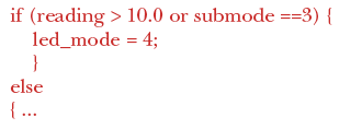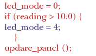 The report shows that we have exercised the code with values of "reading" up to 10.0 but not above. Statement coverage would highlight this too, of course, but will not show the converse, i.e., values of "reading" above 10.0 but not below. And, we need to be sure that "update_panel" has been called with "led_mode" set to 4 and when left with its initial value of 0