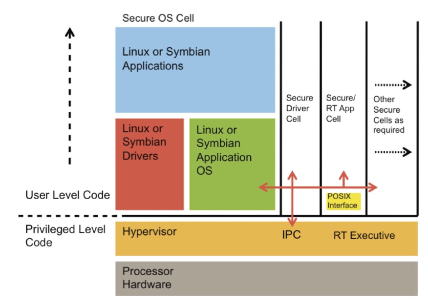 The security threat is an important concern for smartphone developers. These devices run application operating systems such as Linux, Symbian, or Windows Mobile, resulting in several megabytes of code running in privileged mode. Using a secure hypervisor, these large application operating systems can run in secure cells (in user mode) under the control of a hypervisor occupying as little as 65 KB. Even if the application OS is compromised, the hypervisor, running in privileged mode, retains control and is not at risk.