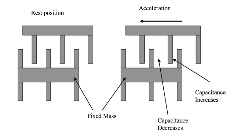 Accelerometer structures often consist of an array of movable fingers and a fixed mass. As the sensor accelerates, the cantilevers move and the capacitance between the fingers changes.