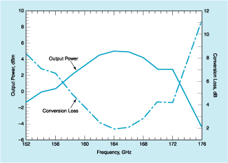Performance measurements indicate that at an input power of 7 mW, the frequency doubler achieves an output power of 5 dBm (approximately 3.2 mW) with a conversion loss of 2 dB at an output frequency of 164 GHz. The device also exhibits a 3-dB output power bandwidth of 14 GHz, marking it as the best-performing MMIC HEMT frequency doubler reported to date for frequencies above 100 GHz.
