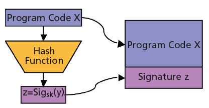A digital signature is computed as shown in Figure 1. There is a key pair consisting of a private key, SK, and a public key, PK. Only the signer has access to SK, whereas PK can be publicly distributed. In our setting, SK is only known to the manufacturer of the embedded system, whereas PK is built into every embedded system. The program code, x, is first hashed to a short fixed length value, y. Typically, y is computed by applying a hash function of the SHA family, resulting in an output of 20 to 32 bytes. Finally, a digital signature is computed over y using the private key, SK. The signature can then be verified by using the public key PK. Please note that the private key, SK, must never leave the secure environment of the manufacturer. Therefore, signatures are typically computed in High Security Modules (HSMs), such as smart card security controllers, which are used in banking applications and which provide tamper-resistant features in accordance with the Common Criteria (CC) security standard.