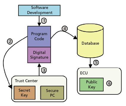 A solution for this problem in general is quite simple. Based on digital signatures, the issuer of the software signs the program code and the embedded system (e.g. the control unit in the vehicle) verifies it. Hence, the issuer holds a private key for signing the program code and the control units hold the corresponding public key for verifying it. This is shown in Figure 2 in more detail. First, the software is developed. Once it is finished (step 1), the program object code is passed to a trust center (step 2) that signs the object code using its private key. The signature is then passed back and attached to the program object code (step 3). The package of code and signature is now stored in a database (step 4) that might hold versions for different embedded systems. Finally, the appropriate program code is downloaded to an embedded system (step 5) and verified by means of its public key (step 6).