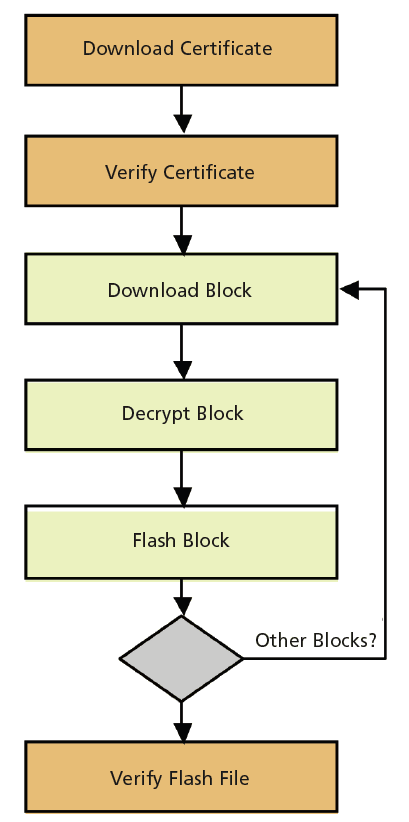 The flash program file has several parts. Each block is optionally encrypted, and the signature of the file was computed beforehand. In the first step, the external device that triggers the flashing process optionally authenticates the bootloader (e.g., by a challenge-re sponse mechanism as described above). In the next step, a certificate might be passed to the bootloader which verifies it’s using its stored public key. Then, the external device passes block by block to the bootloader of the embedded system. The bootloader first decrypts the block and then stores it in the flash memory. At the same time, the bootloader incrementally computes the hash over each block. Once all blocks are passed, the bootloader finalizes the computation of the hash value over the new flash program file and performs a digital signature verification using the determined hash value. If the signature verification is successful, the downloaded file is accepted and activated. Otherwise, a safety procedure is activated and the bootloader awaits the download of a proper flash file. This is shown in Figure 4.