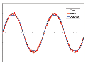 The distinction between signal noise and signal distortion is illustrated in Figure 1. The figure shows a pure sine wave, together with a sine wave that has been compromised by the addition of broadband signal noise and by signal distortion. Distortion is shown as attenuation near the input range limits, which is the typical precursor to signal clipping.