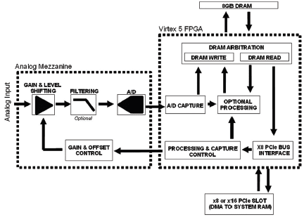 Having considered the desired features of a versatile DAQ system, we now introduce an example of one such system. Ultraview’s line of PCIe DAQ add-in cards support continuous DMA rates of approximately 1GBps into the host system’s RAM, have up to 8GB of on-board memory, and the option of any 1136 pin Xilinx Virtex 5 FPGA (Figure 2). These boards can capture and process data at over 6GBps while simultaneously streaming data across the PCIe bus.