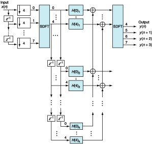 - Certain processing architectures are arbitrarily scalable, such that filter orders and reductions in processing rates can be chosen independently of each other without altering FFT-IFFT lengths. While this is generally true in time-domain approaches, it has not, heretofore, been the case in frequency-domain approaches without altering FFT-IFFT lengths.