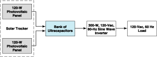 The outputs of the photovoltaic panels are sent to the bank of ultracapacitors for energy storage. Capacitors are excellent for this application in that a complex voltage regulator is not needed, as it would be if batteries were used. The ultracapacitors can tolerate voltage variations up to their maximum voltage rating. The ultracapacitors feed a 300-W, 60-Hz sine-wave inverter for powering various ac loads. A sine-wave inverter was chosen to minimize the generation of noise and to supply clean power to the load.