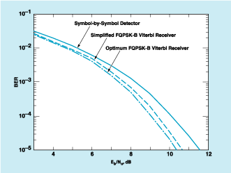 The simplified FQPSK-B Viterbi receiver concept has been tested by computational simulation, and compared with both the optimum FQPSK-B Viterbi receiver and symbol-by-symbol detector using the FQPSK-B proprietary filter. In the simulations, ideal carrier and symbol synchronization was assumed. The simulated channel included a nonlinear solid-state power amplifier operating in full saturation. Because of the shorter constraint length of the reduced trellis, the truncation path length (decoding depth) needed for the simplified FQPSK-B Viterbi receiver was only one-fifth of that needed for the optimum FQPSK-B Viterbi receiver. The results (see figure) show that the simplified FQPSK-B Viterbi receiver can be expected to perform better than the symbol-by-symbol detector using the FQPSK-B proprietary detection filter, and almost as well as does the optimum FQPSK-B Viterbi receiver.