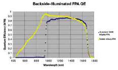 The quantum efficiency of the FPAs used in the Visible-InGaAs MiniCamera exceeds 70% in the 1000 nm to 1600 nm portion of the spectrum. Efficiency tops 50% at 800 nm and 10% at 500 nm (see Figure 2). The FPA’s high-responsivity in both the visible and SWIR wavelength bands allows the camera to assist in hyperspectral imaging, semiconductor wafer inspection, astronomy, and imaging of most laser pointers, designators, and range finders.