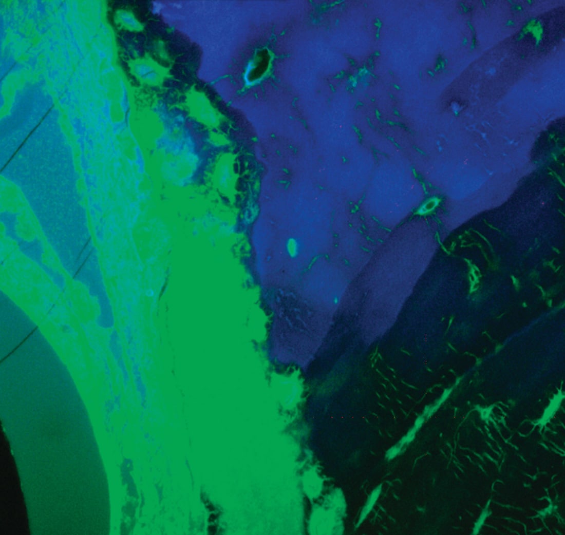 The spatial resolution of the microscope at an excitation wavelength of 780 nm was measured by scanning a 170-nm-diameter fluorescent bead throughout the focal region and found to be 320 nm in the transverse direction and 740 nm in the longitudinal direction. The sectioning capability of two-photon microscopy is demonstrated in Figure 2, which depicts a human bone specimen as imaged by use of two-channel spectral detection.