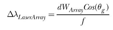 Here, d is the spacing between the grating grooves, WArray is the width of the array of lasers to be combined, θg is the grating angle, and f is the focal length of the collimating optic. As an example, for a focal length of 30 cm, a 2400-line-per-mm-grating, and a laser array width of a few centimeters, the required bandwidth is 5-10 nanometers.