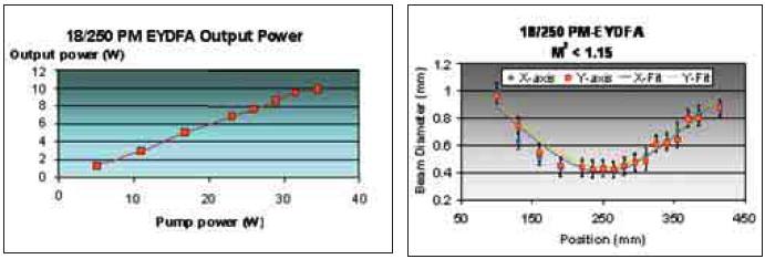 The systems current 18-μm core fiber has a relatively high NA of 0.17, so the core supports more than five modes at 1550 nm. However, despite the multimode nature of the fiber several methods for achieving good beam quality have been developed and are readily applied to this class of “few-moded” fiber. The high NA is primarily a side effect of maintain good energy transfer characteristics between Yb and Er ions, as shown in Figure 3.