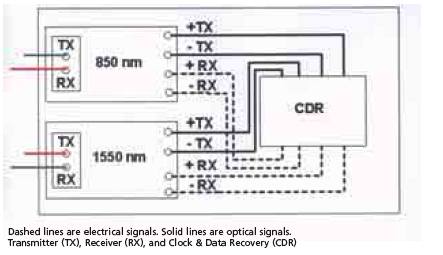 Figure 1 shows a WT block diagram used to convert an 850-nm TDM signal to a 1550-nm signal for transmission to a remote site. The 850-nm signal could be a 1 Gb/s data signal on 200 MHz-km, multimode fiber that needs to be sent to another network site kilometers away. The conversion to 850 nm can be to a TDM signal at 1550 nm, a CWDM wavelength or a DWDM (dense wavelength-division multiplexing) wavelength on the ITUgrid. The choice of system is a matter of distance between sites, bit rate, and budgetary consideration.
