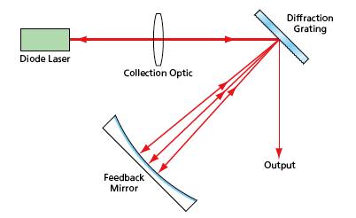 In this configuration, each wavelength component diffracted from the grating is reflected from the mirror back to the point of diffraction. Thus, many wavelength components are simultaneously oscillating in the external cavity. The wavelength range is determined by the range of angles intercepted by the mirror; hence, the wavelength range can be adjusted by moving the mirror to a different position on the diffraction circle. The zeroth-order output of the diffraction grating is used as the laser output.