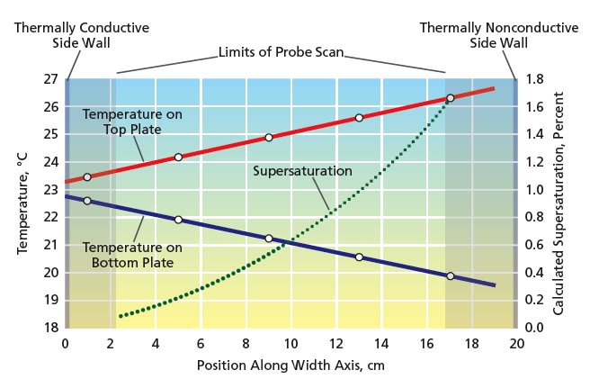 To establish a temperature gradient needed to establish a supersaturation gradient, water at two different regulated temperatures is pumped through tubes along the edges of the copper plates at the thermally-nonconductive- wall side. Figure 2 presents an example of temperature and supersaturation gradients for one combination of regulated temperatures at the thermally-nonconductive-wall edges of the copper plates.