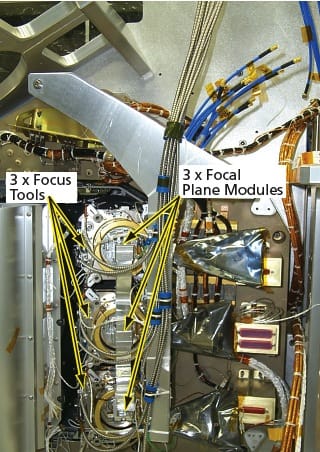 The focus tool consists of two sets of collars, one that mounts to the backside of the interface flange of the instrument optics, and one that mounts to the backside of the interface flange of the focal plane modules. The collars on the instrument optics side have the three small piezo-actuated motors and the three optical displacement metrology systems. Before the instrument is focused, there is no shim ring in place and, therefore, no fasteners holding the focal plane modules to the cameras. Two focus tooling collars are held together by three strong springs.