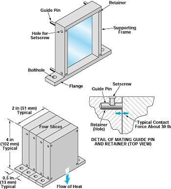 Slices would be mechanically connected to adjacent slices via guide pins and retainers that would mate in the manner of plugs and sockets. Once the guide pins were inserted in the retainers, setscrews would be tightened to push on slanted guide-pin surfaces to generate contact forces. In a module oriented as in the figure, the contact forces between slices would be horizontal. The thermal path for each slice could be vertical and directly into a heat sink if the slice were bolted down onto the heat sink via the boltholes on the flange of its supporting frame.