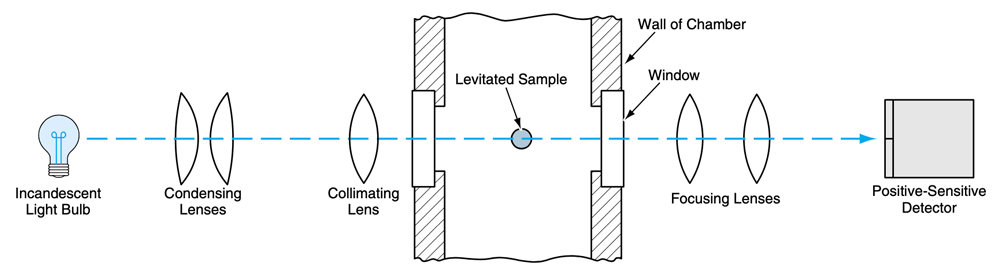 The basic principle of operation of the improved optoelectronic position-measuring apparatus is the same as that of the prior apparatus described above, except that the laser is replaced with an incandescent light bulb and associated optics (see figure). Unlike the light from a laser, the light from an incandescent lamp is not subject to mode shifts and, hence, is spatially and temporally stable in the short term. The spatial distribution of light is better for the intended application because there is no speckle and the illumination is approximately constant across the levitation region. Unlike the light from a laser, the light from an incandescent lamp varies smoothly with applied power and is thus more easily controllable. Finally, a light bulb is easily replaceable and costs much less than does a laser.