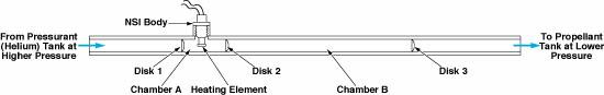 The expansion of gas immediately following the bursting of disk 2 would cause the pressure in chamber A to fall rapidly to value almost as low as that of the propellant tank. The expansion would also cool the gas and thus the heating element. This action would give rise to a large difference of pressure across disk 1, thereby causing disk 1 to burst. The resulting inrush of pressurant gas into chambers A and B would further cool the heating element and would give rise to a large difference in pressure across disk 3, thereby causing disk 3 to burst. The bursting of disk 3 would remove the last barrier, allowing the pressurant gas to flow to the propellant tank. The flow of pressurant gas would also complete the cooling of the heating element.