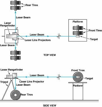 The apparatus is mounted on a tripod between the rear tires, with the rangefinder at approximately the height of the front tire hub. (Exact matching of heights is not necessary in this application because the geometry is such that even at a height difference as large as a few inches, the difference between the horizontal distance and the measured distance is less than the allowable error of 1/8 in.) A target is mounted on the front tire hub. The position and orientation of the apparatus are adjusted until the bright lines projected by the fan beams strike the hubs of both rear tires and the beam from the rangefinder strikes the center of the target. Then the distance is measured by use of the rangefinder, which produces a digital readout. The measurement range is from