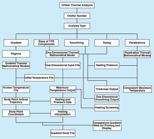 A computer program (see figure) has been developed to serve as a time- and cost-effective means of automating thermal analyses of such hypersonic flight systems as the space shuttle orbiter, the National Aerospace Plane (NASP), and the crew return vehicle (CRV). Heretofore, thermal analyses of the space shuttle orbiter have been performed manually and have, therefore, been hindered by long cycle times and the risk of human error. The present thermal-analysis automation program, which represents an advance in the state of the art, is expected to enable the sizing and analysis of thermal protection systems (TPSs) of re-entry space vehicles (RSVs) while increasing the accuracy of the analyses, reducing the amounts of labor needed to perform the analyses, and reducing the costs of the analyses.