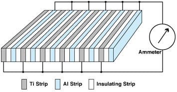 In an atmosphere filled with chemically reactive gases and water vapor, such as are present at liftoff on a launch pad, the vapor corrosion cell is the only device capable of gauging the atmospheric corrosion potential. The cell (see figure) contains strips of alternating, dissimilar, electrically conductive materials — elemental metals or alloys — separated by thin strips of an electrically nonconductive material. In the example of the figure, the dissimilar electrically conductive materials are aluminum and titanium. This device is responsive to (1) the pressures of reactive vapors and the concentration of water vapor in the atmosphere; (2) the nature and surface areas of the two dissimilar conductors; (3) the nature and thickness of the electrically nonconductive separator; and (4) the ambient temperature. By controlling all but one of these parameters, one can operate the vapor corrosion cell in such a manner as to use it to measure the remaining parameters.