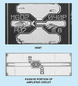 A prototype W-Band, low-noise amplifier has been fabricated by bump-bonding a high-speed, low-noise InP high-electron-mobility (HEMT) transistor onto the previously fabricated passive portion of the amplifier circuit on a GaAs substrate (see figure). The passive portion of the circuit can be regarded as a monolithic microwave integrated circuit (MMIC) that differs from a complete MMIC amplifier only in its lack of a single active device (the HEMT). Therefore, the bump-bonded combination of the active device and the passive portion of the circuit is characterized as a quasi-monolithic millimeter-wave integrated circuit (Q-MMIC).