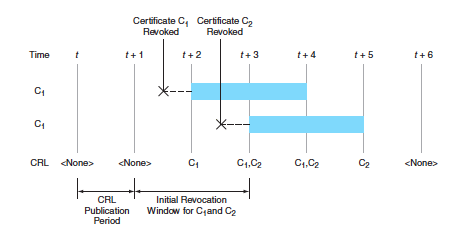 CRLs are generated at uniform time intervals, each interval being denoted a CRL publication period. Revoked certificates are mentioned in the CRLs that occur during possibly longer intervals denoted revocation windows (see figure). A revocation window is the time during which a certificate may be cached without further validation. The revocation window is specified by the issuer and documented in each certificate. By bounding the times during which each revoked certificate must be included in the periodic CRLs, revocation windows limit the sizes of CRLs and thus the costs of distributing them.
